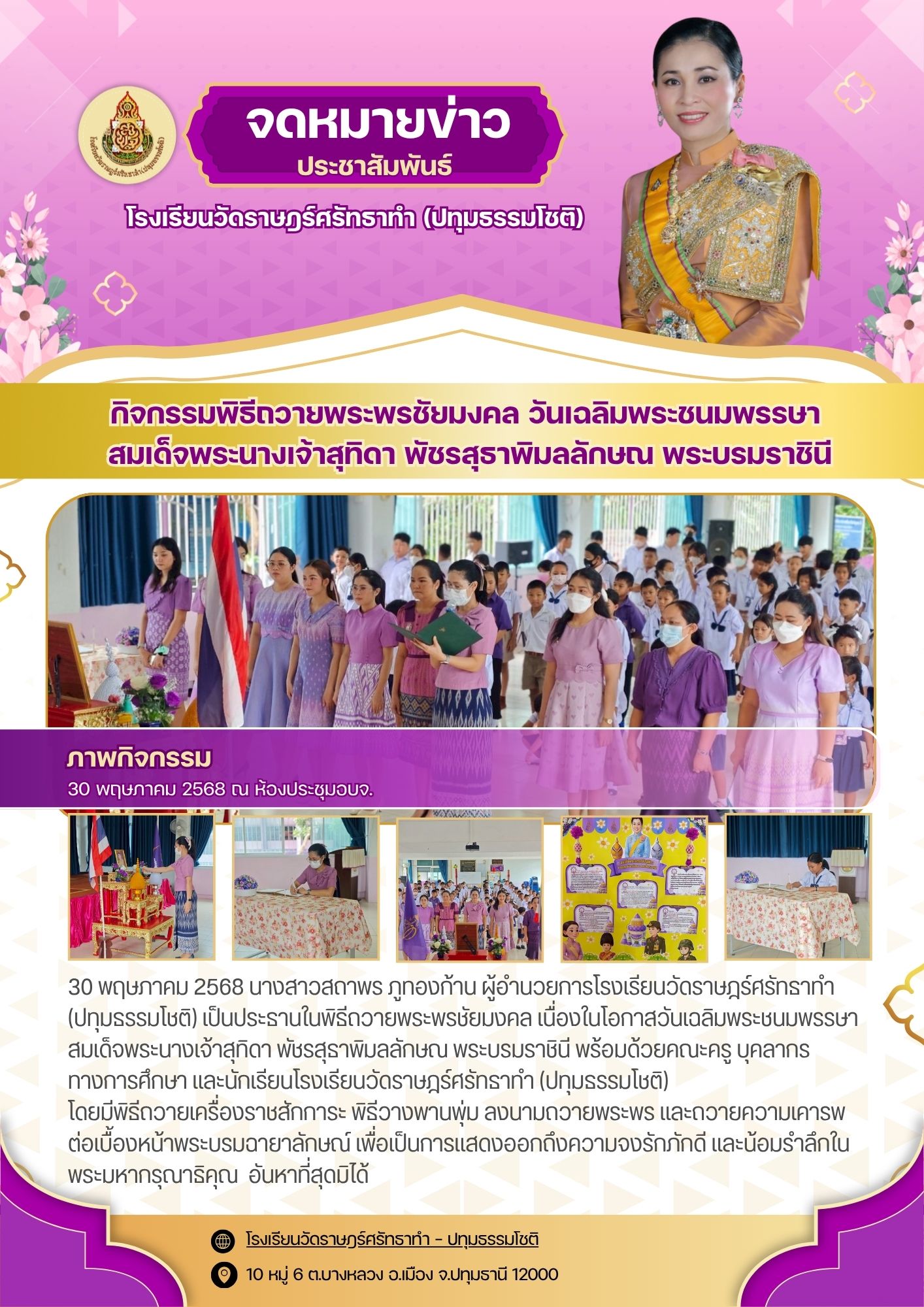 กิจกรรมพิธีถวายพระพรชัยมงคล วันเฉลิมพระชนมพรรษา สมเด็จพระนางเจ้าสุทิดา พัชรสุธาพิมลลักษณ พระบรมราชินี